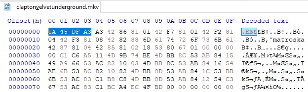<font 12pt/Arial,sans-serif;;inherit;;inherit>File signature MKV datoteka je 1A 45 DF A3, prikazano na slici 1.</font>