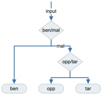Ova metoda uključuje treniranje dva različita Random forests klasifikatora. Prvi klasifikator odlučuje o tome je li PDF dokument benigni ili maliciozan. Drugi klasifikator primjenjuje se samo na maliciozne PDF dokumente. Njegova uloga je klasifikacija dokumenta na one koji su namijenjeni phishing napadima na velikoj skali ili na one koji su namijenjeni za ciljane napade. Na donjoj slici ilustriran je ovaj pristup. Benigni dokumenti su označeni sa “ben”, a maliciozni sa “mal”. Maliciozni dokumenti namijenjeni phishing napadima na velikoj skali označeni su sa “opp”, a oni za ciljane napade su označeni sa “tar”.