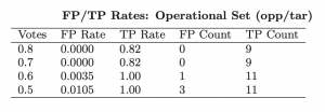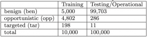 Donja tablica prikazuje performanse drugog klasifikatora za klasifikaciju PDF dokumenata namijenjenih za phishing napade na velikoj skali i one namijenjene za ciljane napade. Postotak detekcije malicioznih dokumenata za ciljane napade je također vrlo visok (TP rate u tablici), dok je razina false positive slučajeva opet vrlo niska (FP rate u tablici).