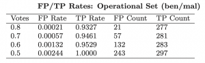 Donja tablica prikazuje performanse prvog klasifikatora benignih i malicioznih PDF dokumenata. Vidljivo je da je postotak detekcije malicioznih primjera vrlo visok (TP rate u tablici), dok je razina false positive slučajeva vrlo niska (FP rate u tablici).