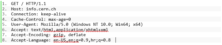 The request begins with the HTTP method to indicate the desired action to be performed on the identified resource. Methods are GET, POST, PUT, OPTIONS, PUT, DELETE, TRACE and CONNECT. The most used method is a GET method. GET requests a representation of specified resource. It is only used to retrieve data and it should never have any other effect. For the list of all methods and their use check sources [6] and [5].