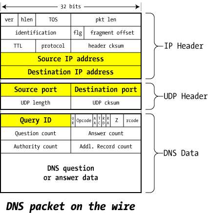 Za razumijevanje načina funkcioniranja napada potrebno je znati sadržaj DNS paketa. Slika ispod prikazuje polja DNS paketa te su žutom bojom označena polja koja su bitna za razumijevanje ranjivosti.