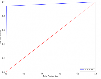 U nastavku su prikazane srednje vrijednosti točnosti, preciznosti, recall-a i F1 mjere na 5 foldova te ROC krivulja na foldu s najvećom točnosti. Na njoj se također vidi da je trenutno najveća greška modela nemogućnost detekcije svih malicionih URL-ova unutar testnog skupa, odnosno manji recall.