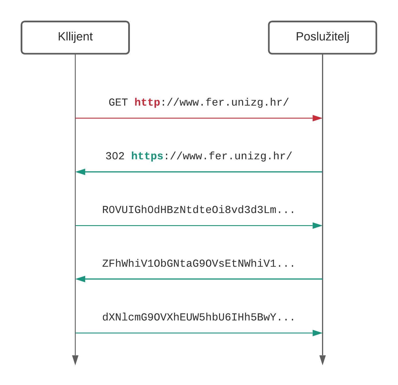 Slika 3. Uobičajen tijek komunikacije između klijenta i poslužitelja konfiguriranog da prihvaća samo sigurne veze. Klijenti resursima često inicijalno pristupaju preko protokola HTTP, a poslužitelj ih preusmjerava na HTTPS.