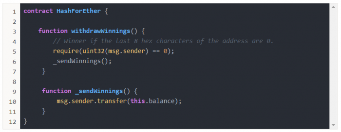 Svrha ovog ugovora je dodijeliti nagradu sretnim dobitnicima - korisnicima sa adresom čijih su zadnjih 8 hex znakova nule. Ukoliko se provjera uspješno izvrši, poziva se funkcija _sendWinnings koja šalje pobjedniku novčanu nagradu. Problem je u tome što je autor ugovora HashForEther zaboravio specificirati vidljivost funkcije _sendWinnings na privatnu te bilo tko može jednostavno pozvati izravno tu funkciju i dobiti novčanu nagradu.