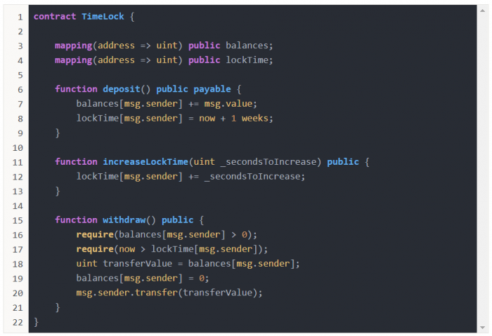 Zamišljena funkcionalnost prikazanog pametnog ugovora TimeLock je pohrana novca te mogućnost podizanja uz minimalnu vremensku odgodu od jednog tjedna. Uporabom funkcije increaseLockTime, klijent može proizvoljno povećati željeno vrijeme na koje će sredstva biti zaključana. Upravo je u toj funkciji sigurnosna prijetnja - poznavanjem činjenice da varijabla tipa uint može sadržavati brojeve zapisane maksimalno sa 256 bitova te poznavanjem trenutnog vremena na koje su sredstva zaključana, vrlo je lako izračunati potreban broj sekundi koji treba pribrojiti da bi se dogodio overflow te da bi se sredstva otključala upravo sada.