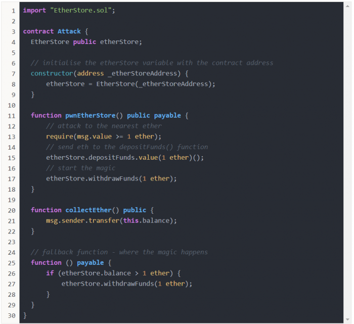 U ovom primjeru EtherStore je napadnuti ugovor, a Attack je ugovor napadač.Originalna željena funkcionalnost ugovora EtherStore je da pohranjuje riječnik stanja računa svojih klijenata. Neki klijent može pohraniti određenu količinu valute (wei-ja) koji će se dodati na njegovo stanje računa, te može podizati wei-je sa svog računa. Naravno, u metodi za podizanje novaca, pametni ugovor EtherStore provjerava je li iznos koji se pokušava podići manji od stanja računa klijenta (naravno, nije moguće podići više sredstava nego što postoji na računu) te postoji ograničenje da svaki klijent može podići sredstva maksimalno jednom u tjedan dana. Ova su ograničenja vidljiva u linijama 14 i 16 pametnog ugovora EtherStore. U liniji 17, EtherStore šalje sredstva klijentu te u linijama 18 i 19 osvježava stanje računa i vremensku oznaku zadnjeg podizanja novca.