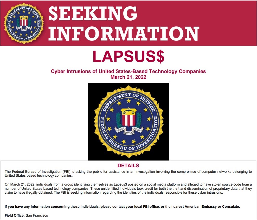 LAPSUS$ je međunarodna kibernetička kriminalna skupina koja je stekla reputaciju po provođenju kibernetičkih napada s fokusom na iznudu podataka. Prvi puta su privukli pažnju javnosti kada su izveli napad ransomware-a na Ministarstvo zdravstva Brazila u prosincu 2021., ugrozivši podatke o COVID-19 cijepljenju milijuna stanovnika. Nakon toga, grupa je nastavila svoj niz napada, ciljajući velike tehnološke korporacije kao što su Nvidia, Samsung, Microsoft, Vodafone te čak i tvrtka Ubisoft. Njihovi napadi nisu bili ograničeni samo na krađu podataka, poremetili su i usluge tvrtki te stajali iza napada na EA Games. Istražitelji su identificirali tinejdžera iz Engleske kao glavnog organizatora grupe, dok se sumnja da bi drugi član mogao živjeti u Brazilu. Članovi grupe pokazuju izuzetnu vještinu u hakiranju, a jedan od njih je toliko stručan da su istraživači prvotno pomislili da je njegov rad automatiziran. LAPSUS$ se ne drži određene političke skupine ili filozofije, a poznati su po nedostatku profesionalnosti čak i među ransomware bandama. Grupa ne poštuje svoja obećanja o uništenju ukradenih podataka i ne ulaže puno truda u prikrivanje tragova ili skrivanje tehnika. Iako je londonska policija uhitila sedam osoba povezanih s LAPSUS$ u ožujku 2022., samo su dvije osobe optužene. Ironično, grupa koja se bavi “doxxingom” pružila je informacije koje su dovele do uhićenja, no to nije značajno utjecalo na operacije grupe. LAPSUS$ i dalje održava javni profil, redovito komunicira putem Telegrama i e-pošte te nastavlja iznuditi i objavljivati podatke žrtava.