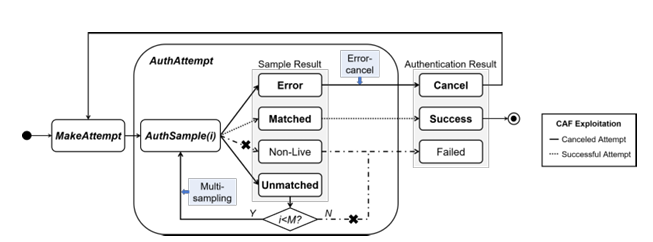 3. “BrutePrint” [6]: Istraživanje provedeno od strane kineskih znanstvenika Yu Chena i Yiling He otkirlo je ranjivosti u implementaciji generičkog senzora otiska prsta na Android pametnim telefonima, nazvavši napad “BrutePrint”. Otkriveni nedostaci - Cancel-After-Match-Fail (CAMF) i Match-After-Lock (MAL), omogućuju napadaču da izvede napad bez fizičkog kopiranja otiska prsta. CAMF iskorištava multisampling metodu senzora, omogućujući ciklus pokušaja autentikacije i ponovni početak nakon pogreške, dok MAL omogućuje slanje novih slika čak i nakon neuspješnog pokušaja autentikacije. Svi testirani pametni telefoni su bili ranjivi na barem jedan od ovih napada.