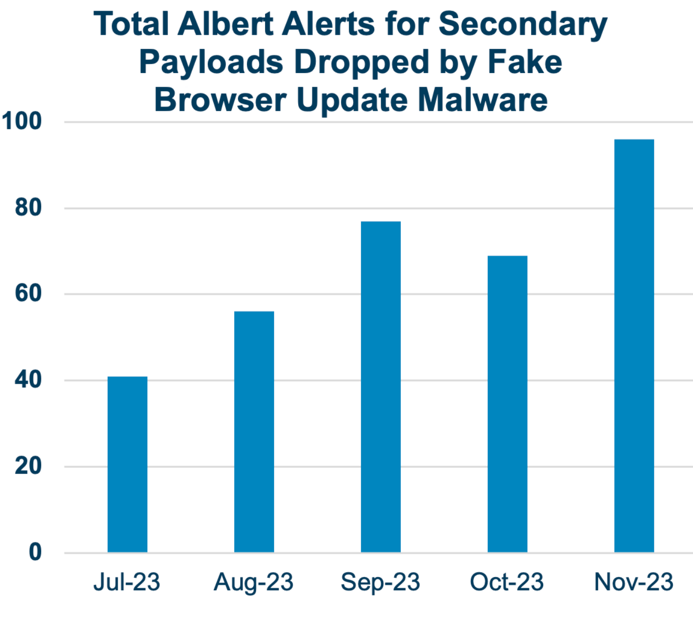 Lažna ažuriranja sve učestalije dolaze s dodatnim zlonamjernim teretom koji se preuzima uz preuzimač, što je prikazano na 4. slici. Prema podacima MS-ISAC-a (Multi-State Information Sharing and Analysis Center), u razdoblju od srpnja do studenog 2023. godine zabilježen je porast tri vrste sekundarnog tereta.