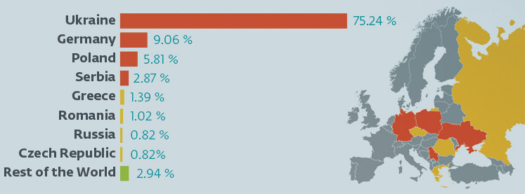 Još dramatičniji primjer dogodio se u Ukrajini, gdje su hakeri infiltrirali tvrtku Medoc koja razvija računovodstveni softver. Ubacivanjem zlonamjernog koda u ažuriranja softvera, koji koristi oko 80% ukrajinskih korporacija, stvorili su podlogu za kasniji NotPetya napad. Ovaj je napad prvo paralizirao ukrajinske komunalne tvrtke i javne korporacije, da bi se kasnije proširio globalno [5]. Više detalja o njegovom širenju prikazuje 6. slika.