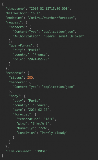 Kod dizajniranja API logova, važno je izbjeći pretjerano logiranje koje stvara šum i otežava analizu. Logovi trebaju biti konzistentni i dovoljno strukturirani da se mogu pretraživati i korelirati. Također jako je važno voditi računa o tome da logovi sami po sebi ne postanu sigurnosni problem te je poželjno izbjegavati logiranje osjetljivih podataka kao što su lozinke, sjednički tokeni, tajni ključevi i druge povjerljive informacije ili kada je to potrebno, obaviti njihovo maskiranje i sanitizaciju [3]. Primjer jednog API loga prikazan je slikom 1.
