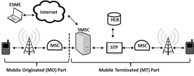 Jezgreni dio mobilne mreže sastoji se od MSC (Mobile Switching Center) i SMSC (Short Message Service Center). MSC upravlja signalizacijom, preusmjeravanjem i međusobnim povezivanjem korisnika, dok SMSC služi za obradu i prosljeđivanje SMS poruka. Dakle u principu bazna stanica šalje poruku MSC koji poruku prosljeđuje do SMSC, SMSC vrši potrebnu obradu poruke i pomoću baza podataka, od kojih je najpoznatija HLR (Home location registry, u novijim mrežama HSS/UDM), saznaje u kojem MSC području se nalazi primatelj, zatim prosljeđuje navedenu poruku do MSC koji će primatelju proslijediti poruku. SMSC implementira “Store and forward”, dakle u slučaju da korisnik nije dostupan u trenutku slanja poruke, SMSC će u određenim vremenskim intervalima provjeravati korisnikovu dostupnost i čim bude dostupan poslati mu navedenu poruku.[3][4]