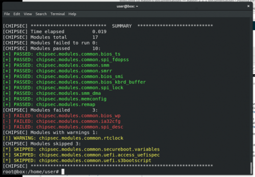 Chipsec je moćan framework za procjenu sigurnosti platforme koji može analizirati živi sustav ili statički dump. Njegova glavna moć je automatizirana provjera hardverskih zaštita, npr. pokretanje skripte chipsec_main.py može otkriti je li uključena BIOS Write Protection zaštita (koja sprječava pisanje po flash memoriji) ili su ranjivi SMM (System Management Mode) mehanizmi. Ako Chipsec prijavi “FAILED” na ovim ključnim zaštitama, to je snažan indikator da je sustav podložan napadima ili već kompromitiran.