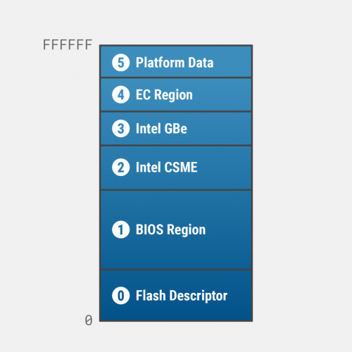 Logička struktura Intel SPI Flash memorije. (0) Flash Descriptor definira početak i kraj svih ostalih regija. (1) BIOS (ili UEFI) Region sadrži glavni UEFI kod i NVRAM varijable, dok (2) Intel CSME (Converged Security and Management Engine) sadrži firmware za zasebni sigurnosni procesor. Ostale regije poput (3) GbE (mrežne postavke) i (4) EC (Embedded Controller) su specifične za platformu.