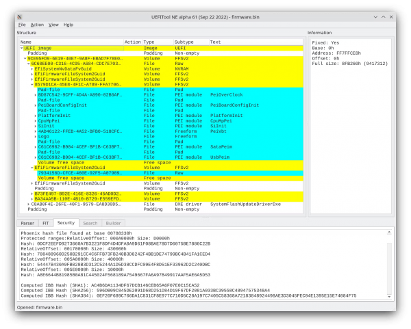 Prvi korak je pretvaranje binarnog oblika u čitljivi oblik, a standardni alat za ovu namjenu je UEFITool (open-source rješenje autora Nikolaja Schleja). Alat prikazuje stablo firmwarea, koje omogućuje forenzičaru pregled GUID-ova (jedinstvenih identifikatora modula), imena drivera i sekcija. U ovom koraku forenzičar aktivno traži module koji nemaju ime (Unnamed), module s neobičnim GUID-ovima ili DXE drivere koji su naknadno dodani u odnosu na originalne tvorničku postavke. UEFITool također omogućuje ekstrakciju sumnjivih modula (opcija Extract Body) za daljnju analizu reverznim inženjerstvom u alatima poput IDA Pro ili Ghidra.