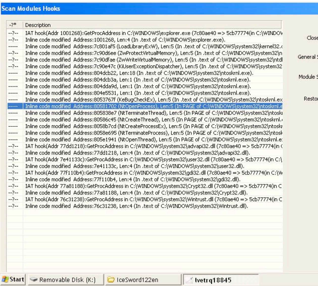 Zlonamjerni kod ubrizgan je u ntoskrnl.exe jezgre operativnog sustava Windows koji je hooko SSDT API za NtOpenProcess, NtTerminateThread, NtCreateThread, NtCreateProcessEx, NtTerminateProcess i NtOpenThread. Ovaj rootkit može pratiti i kontrolirati svaki pokušaj pokretanja novog procesa ili ubijanja postojećeg.