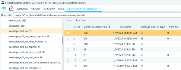 Nakon dekriptiranja, baza sadrži tablice poput messages, chat_list, group_participants koje se mogu analizirati SQL upitima ili specijaliziranim forenzičkim alatima.