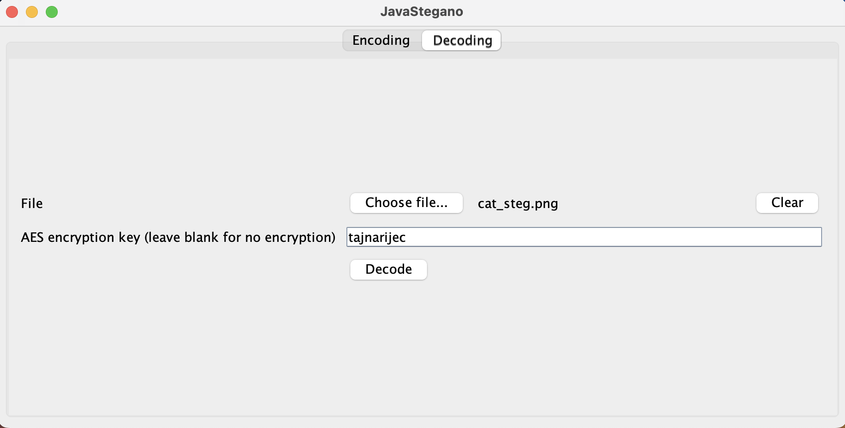 Slika 2 prikazuje karticu za dekodiranje poruke. Korisnik u ovom koraku odabire datoteku za koju pretpostavlja da sadrži skrivene podatke te unosi ključ za dešifriranje. Aplikacija potom iz datoteke izdvaja skrivene bitove, rekonstruira šifriranu poruku i pokušava je dešifrirati pomoću unesenog ključa.