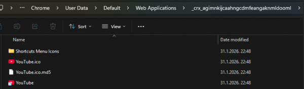 Taj uninstall string zapravo poziva Chrome s parametrom –uninstall-app-id=<identifikator>, što je interni način da Chrome ukloni PWA (obriše njene datoteke i unose). Na datotečnom sustavu, glavno spremište PWA nalazi se unutar korisničkog profila Chromea. U direktoriju profila (primjerice %LOCALAPPDATA%\Google\Chrome\User Data\Default\) Chrome kreira poddirektorij Web Applications\_crx_<identifikator>\ u kojem drži podatke o instaliranoj PWA.