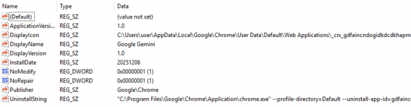 Ovaj identifikator (app-id) je jedinstven za svaku instaliranu PWA i generira se na temelju domena/aplikacije. Kada korisnik pokrene PWA prečac, sustav zapravo pokreće Chrome s navedenim parametrom. To rezultira pojavom prozora aplikacije bez uobičajenog Chrome sučelja, unutar kojeg se učitava PWA sadržaj. Drugo, prilikom instalacije PWA ažurira se Windows registar. Chrome registrira novu aplikaciju u registru za potrebe deinstalacije. U grani registra HKEY_CURRENT_USER\Software\Microsoft\Windows\CurrentVersion\Uninstall\ pojavit će se novi ključ koji predstavlja tu PWA aplikaciju. Ime ključa obično je nasumični GUID ili hash, a unutar njega se nalaze vrijednosti poput: naziv aplikacije (npr. “Youtube”), izdavač (“Google\Chrome”), datum instalacije, putanja do ikone (koja se nalazi u Chrome profilu) te Uninstall string iliti naredba kojom Chrome može deinstalirati tu PWA.